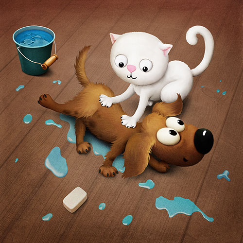 Prvá rozprávka o psíkovi a mačičke prináša veselé príhody dvoch kamarátov – prečítajte si, ako spoločne umývali podlahu a zabávali sa pri tom!